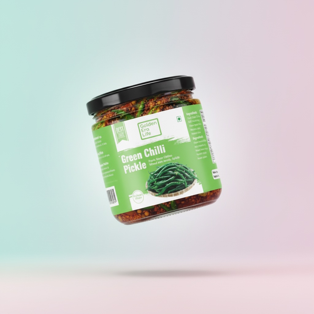 “देसी  हरी मिर्च का तीखा-चटपटा अचार – घर का बना, कच्ची घानी सरसों तेल में भरा हुआ! मसाले से भरपूर, बिना सिरका, बिना प्रिज़र्वेटिव – एक कौर में मुँह में आग और मज़ा दोनों! पराठे के साथ, दाल-चावल के साथ, या ऐसे ही चटकारे लेते हुए – मिर्च प्रेमियों का सबसे पसंदीदा। उत्तर भारत की थाली का असली तड़का!”