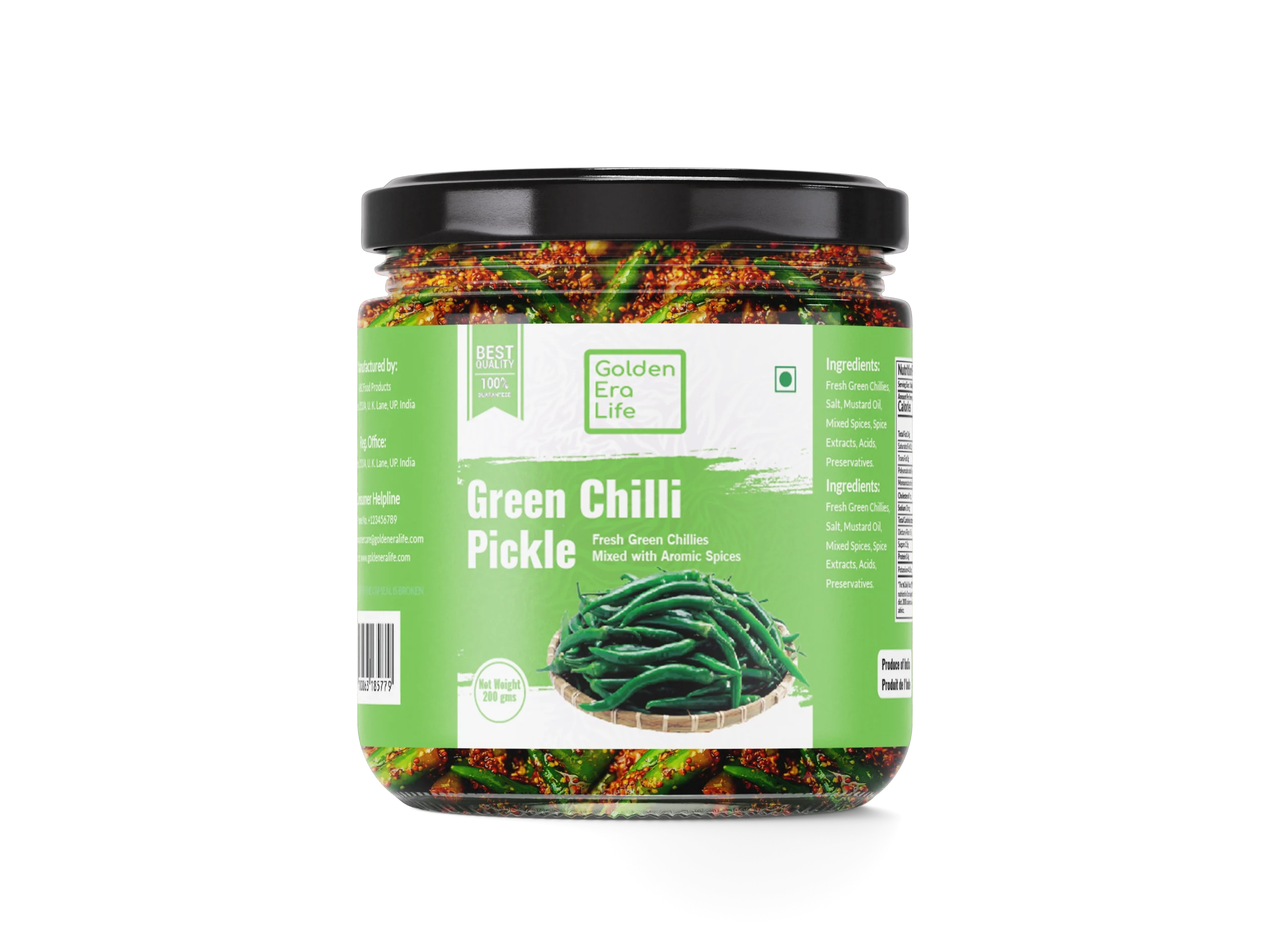 (Translation: Thick desi green chilli spicy-tangy pickle – homemade, filled in cold-pressed mustard oil! Loaded with spices, no vinegar, no preservatives – one bite brings both fire and fun! With paratha, dal-rice, or just licking away – favourite of chilli lovers. The real zing of a North Indian thali!)